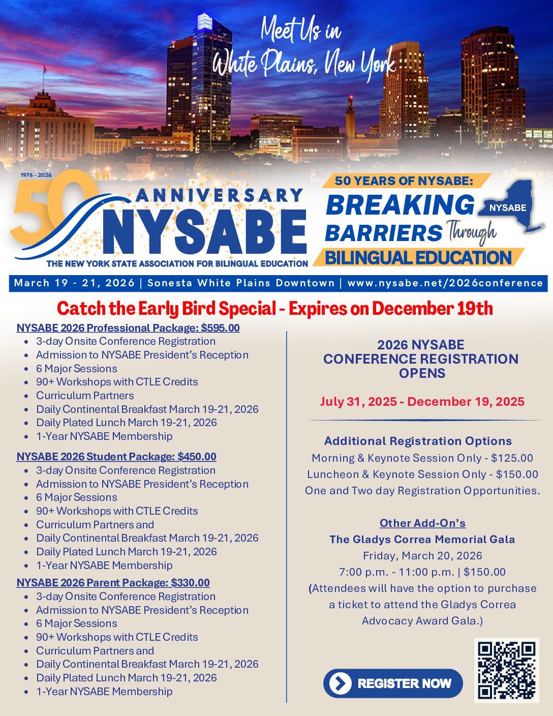 Welcome to the 50th Anniversary Conference of the New York State Association for Bilingual Education (NYSABE). This year, we proudly celebrate a powerful milestone: half a century of advocacy, service, and unwavering commitment to advancing equity for multilingual learners across New York State.